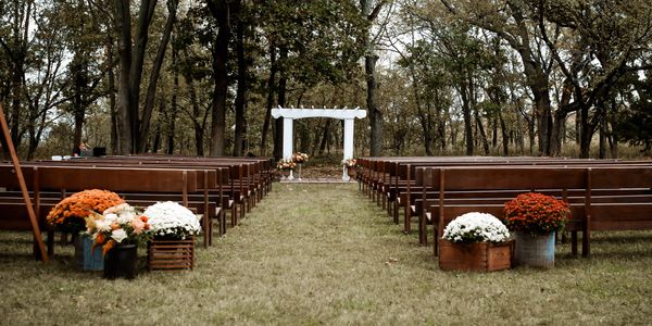 We offer both indoor and outdoor ceremony and reception options, all at one convenient location, ensuring a seamless experience for you and your guests. One of our standout features is our charming back patio, complete with a grain bin bar and high-top tables, all set amidst picturesque woodsy scenery and refreshing country air. Our venue is designed to bring your vision to life while staying within your budget.